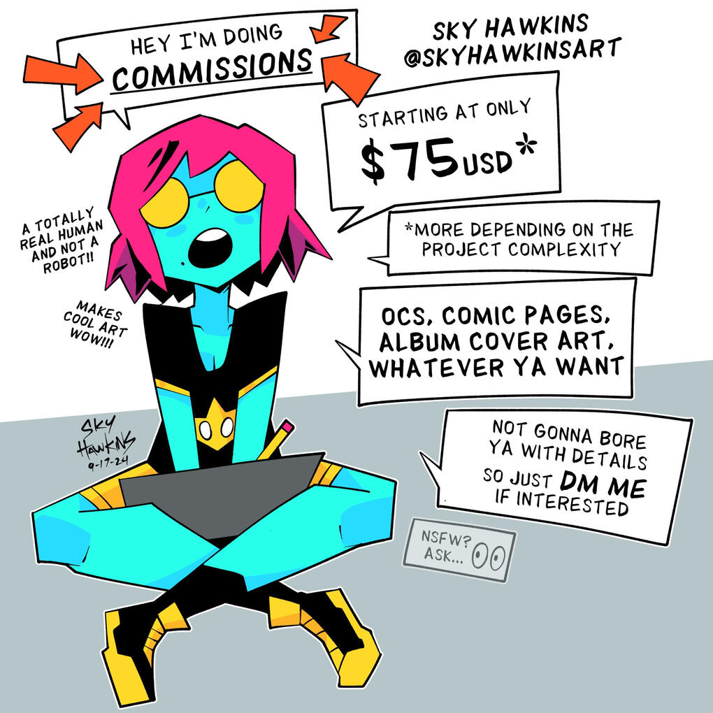 I'm Sky, a writer / illustrator trying to make cool comic books for a living. Always looking for work. I can do basically anything except for making a website